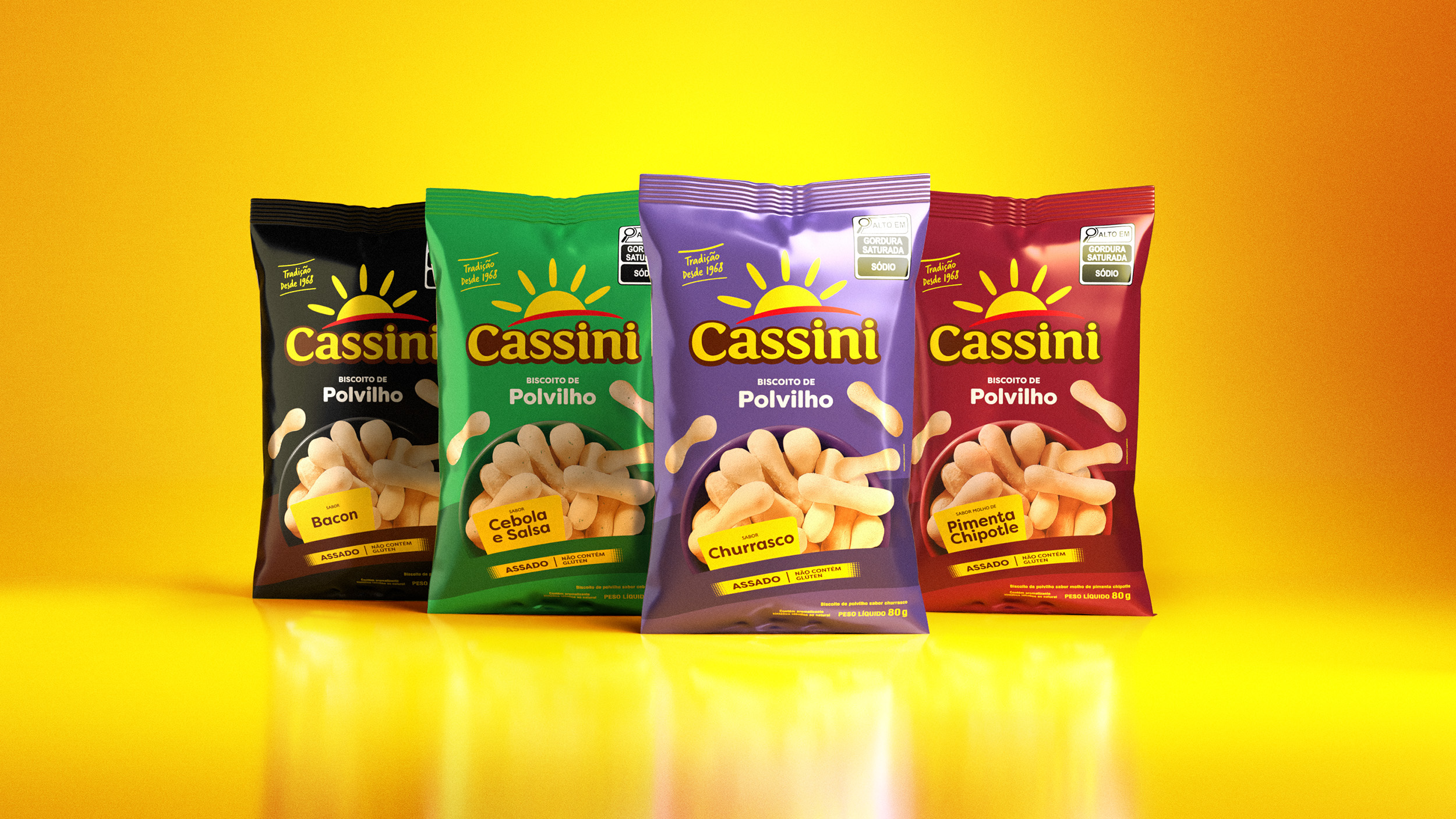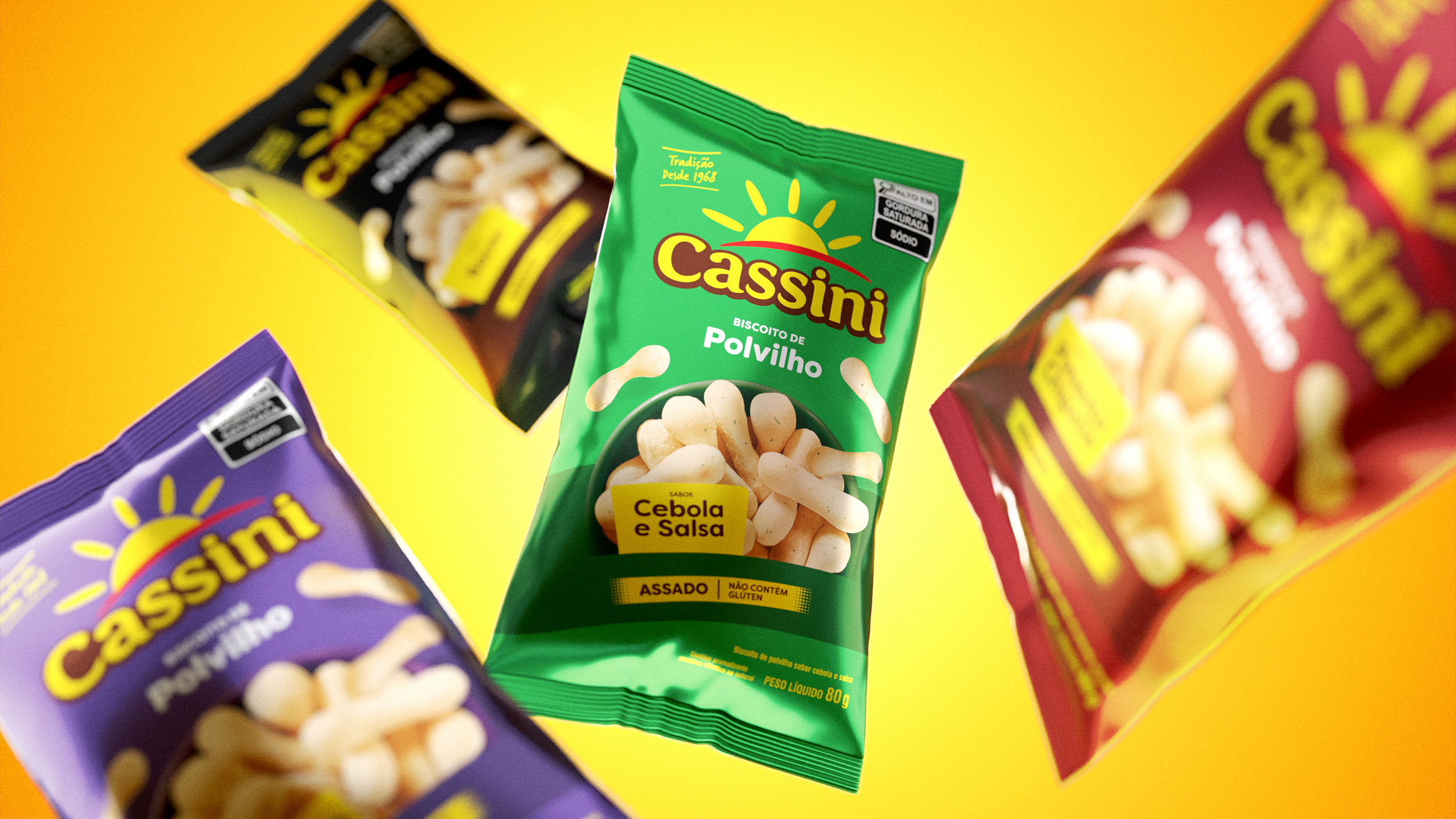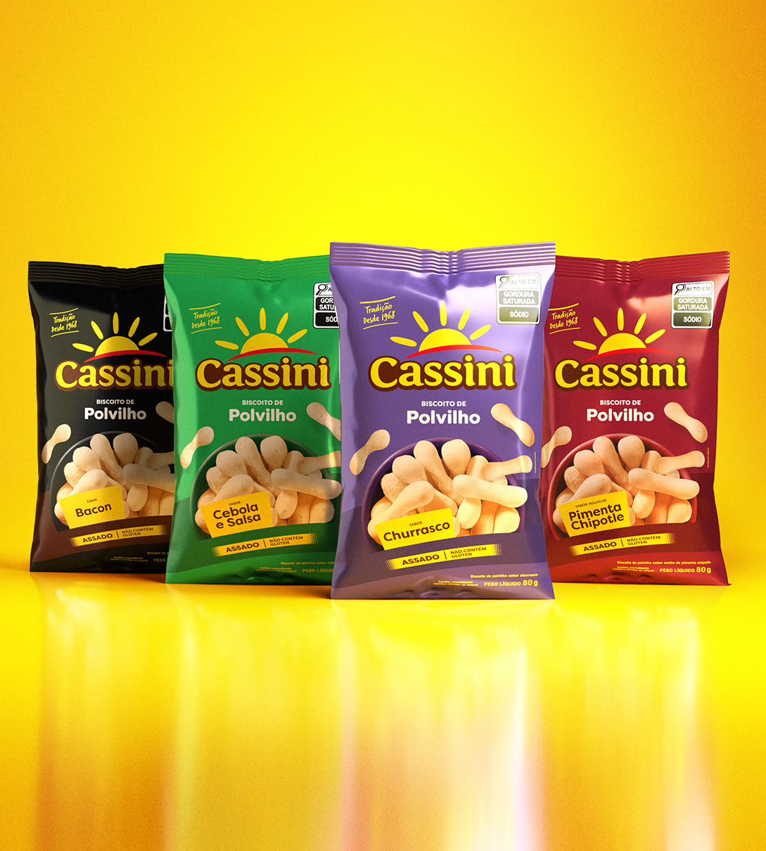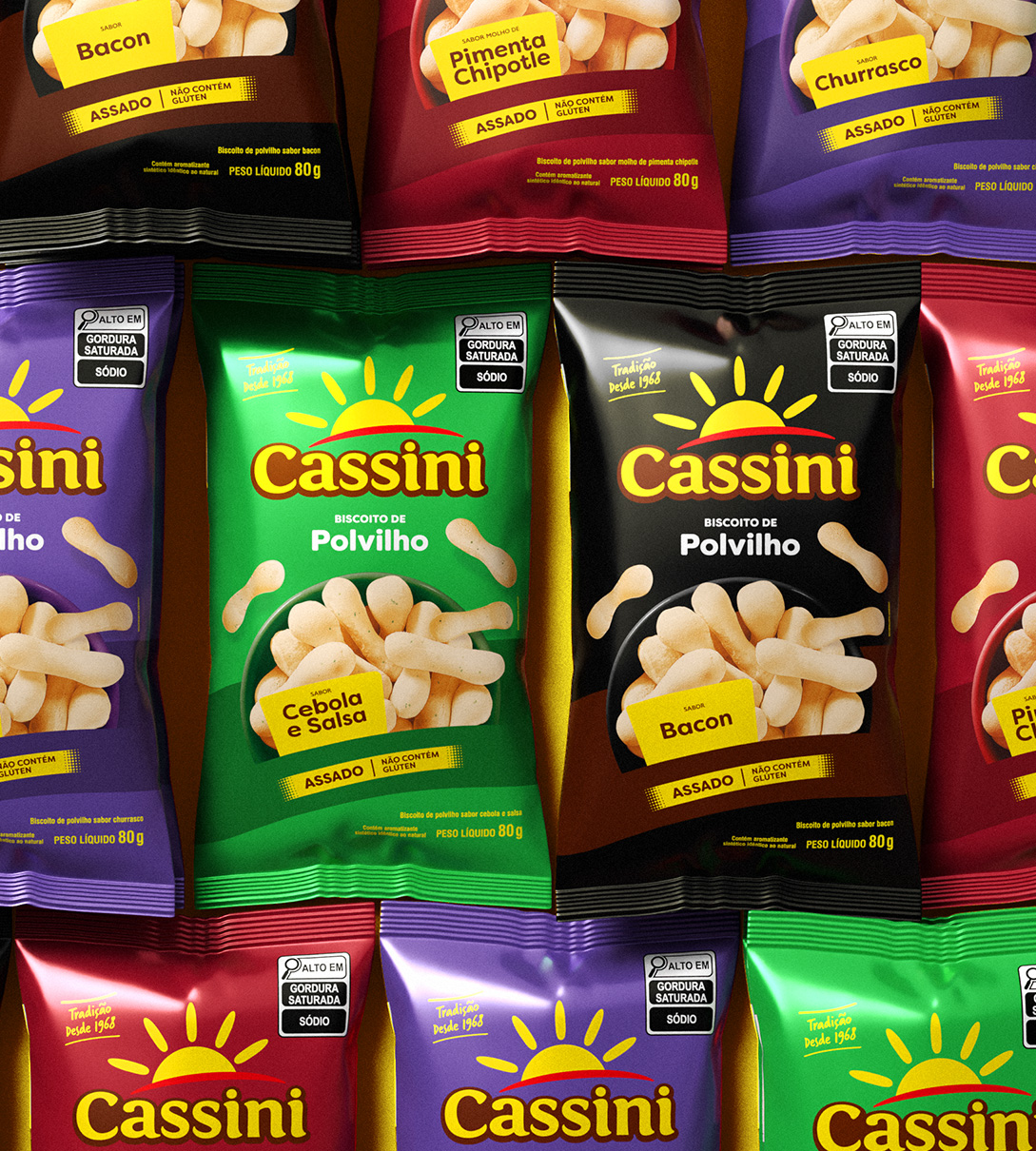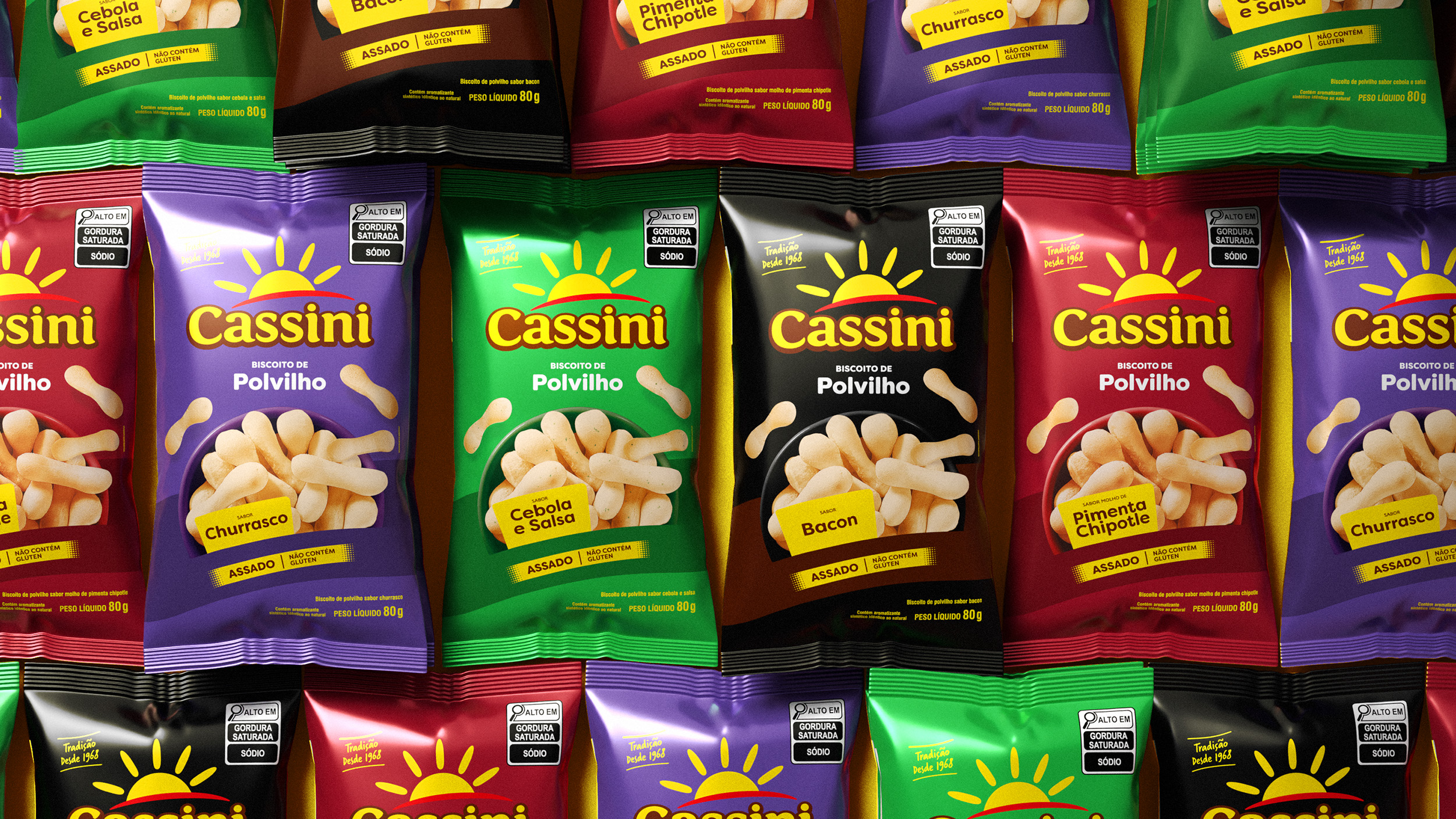 Novo design das embalagens de polvilhos saborizados da Cassini reforça seu avanço no mercado de snacks. O acabamento metalizado garante mais proteção, shelf life ampliado e destaque nas gôndolas.
